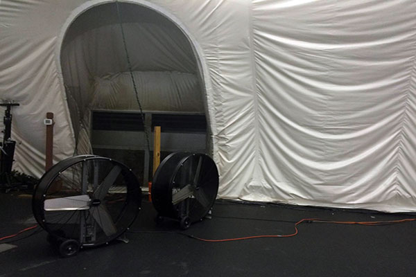 一般配備兩臺主風機,室內需要新風時,兩臺風機同時運轉,保證新風量的供應,滿足室內人員呼吸新鮮空氣的需要;室內沒有人活動時,只開一臺主風機,提供足夠的內外氣壓差,保證氣膜建筑正常工作,同時,為用戶盡量節省電能。另外配備一臺備用風機,當主風機發生故障時,啟動備用風機。