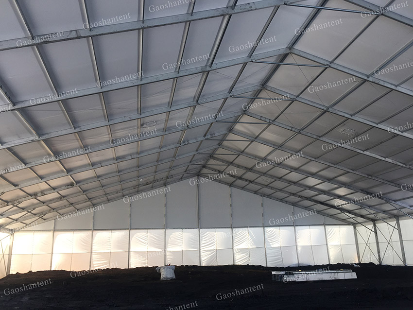 與傳統(tǒng)建筑相比,篷房本身屬于臨時(shí)建筑,不需要繁瑣的審批手續(xù),高山利用客戶園區(qū)自由場(chǎng)地,建造跨度50m、頂高15m的全鋁合金倉(cāng)儲(chǔ)中轉(zhuǎn)空間,隨著加工地點(diǎn)、環(huán)保要求的變化,靈活實(shí)現(xiàn)可移動(dòng),從容解決環(huán)保難題。