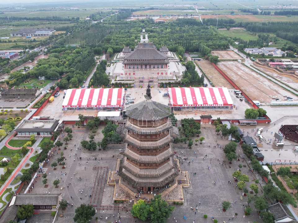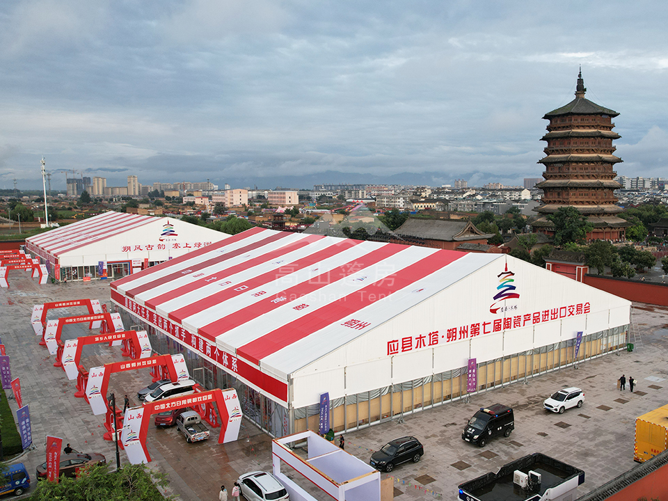 應縣木塔作為世界上最高、最古老的木構塔式建筑,凝聚著千年的歷史厚重感。而本屆陶瓷交易會的展館——由高山篷房精心設計與建造的臨時場館,與這座千年木塔相映成趣。
