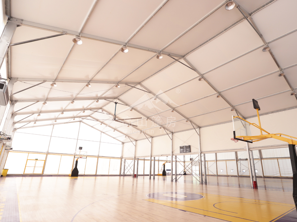 體育篷房采用模塊化設計,跨度可達50米且內部無立柱,完美適配籃球、羽毛球等對空間要求高的運動。通過配置專業地板、照明及通風系統,篷房可輕松切換為多功能場館——上午舉辦籃球賽,下午改造為羽毛球場,晚上轉為文藝演出空間。其結構具備極強的環境適應性:鋁合金框架與PVC篷布可抵抗10級大風及-30℃至50℃的極端溫度,結合雙層保溫層與智能通風系統,實現冬暖夏涼的舒適環境。